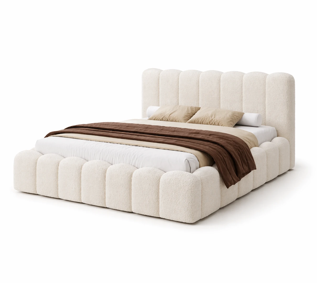 Łóżko zostało wykonane w modnej tkaninie bouclé, która nadaje wnętrzu przytulny i elegancki charakter. Miękkie wykończenie oraz zaokrąglone formy wpisują się w aktualne trendy wnętrzarskie.