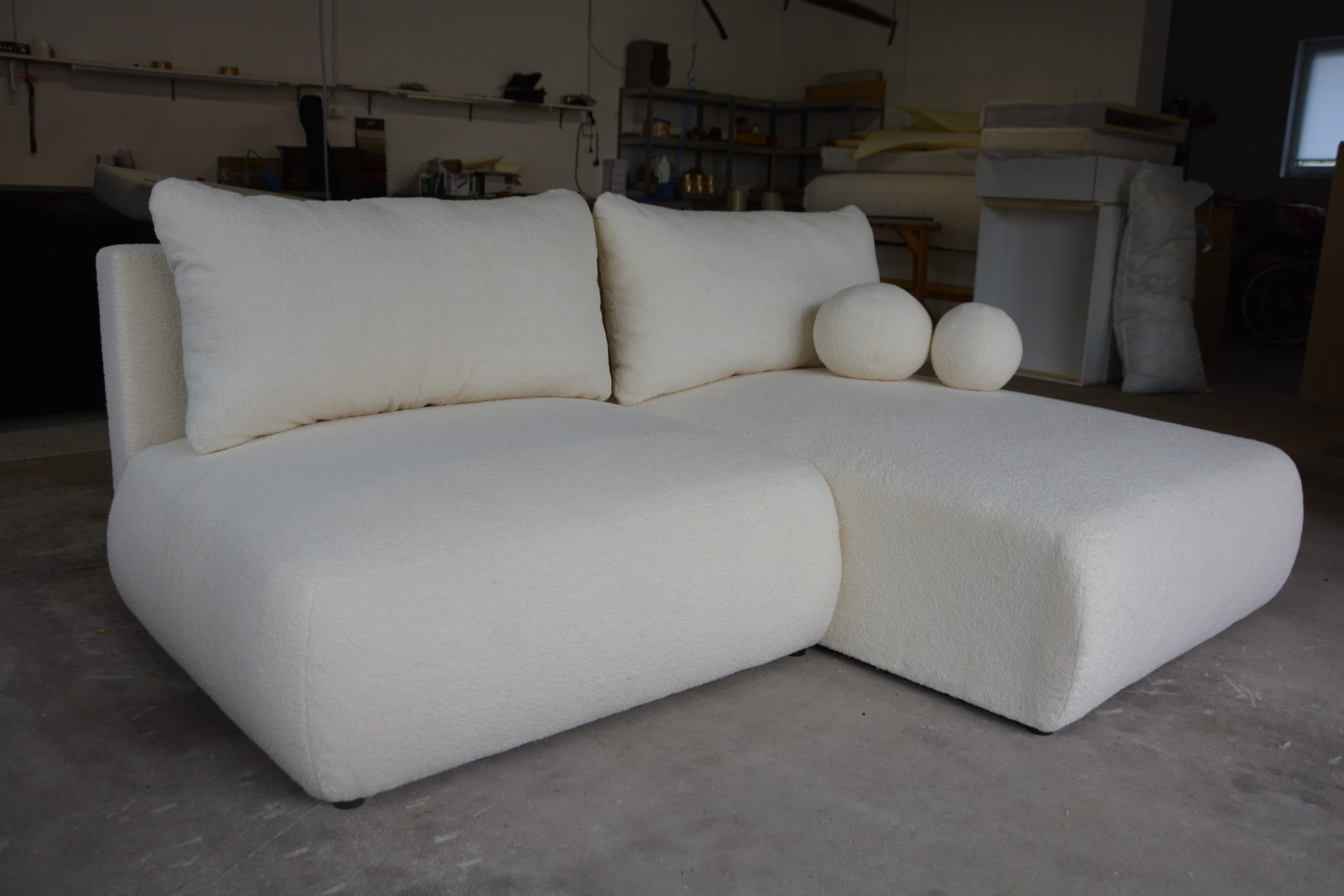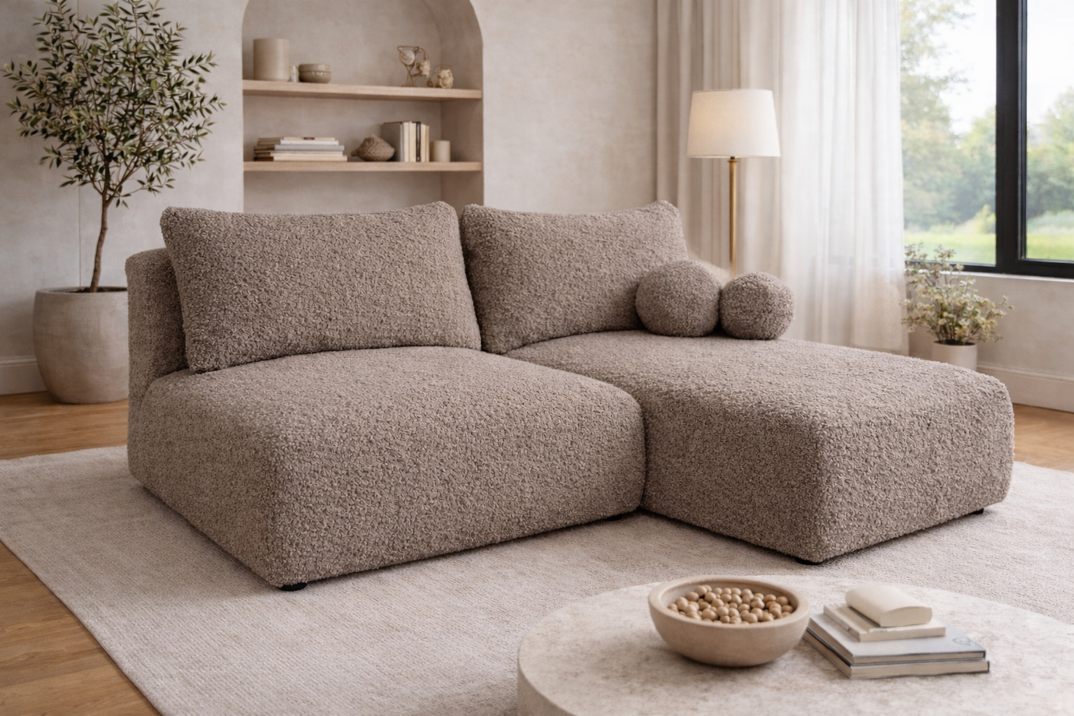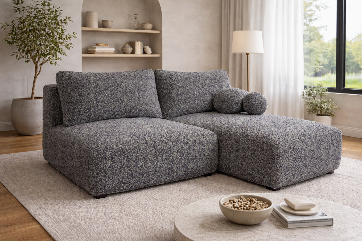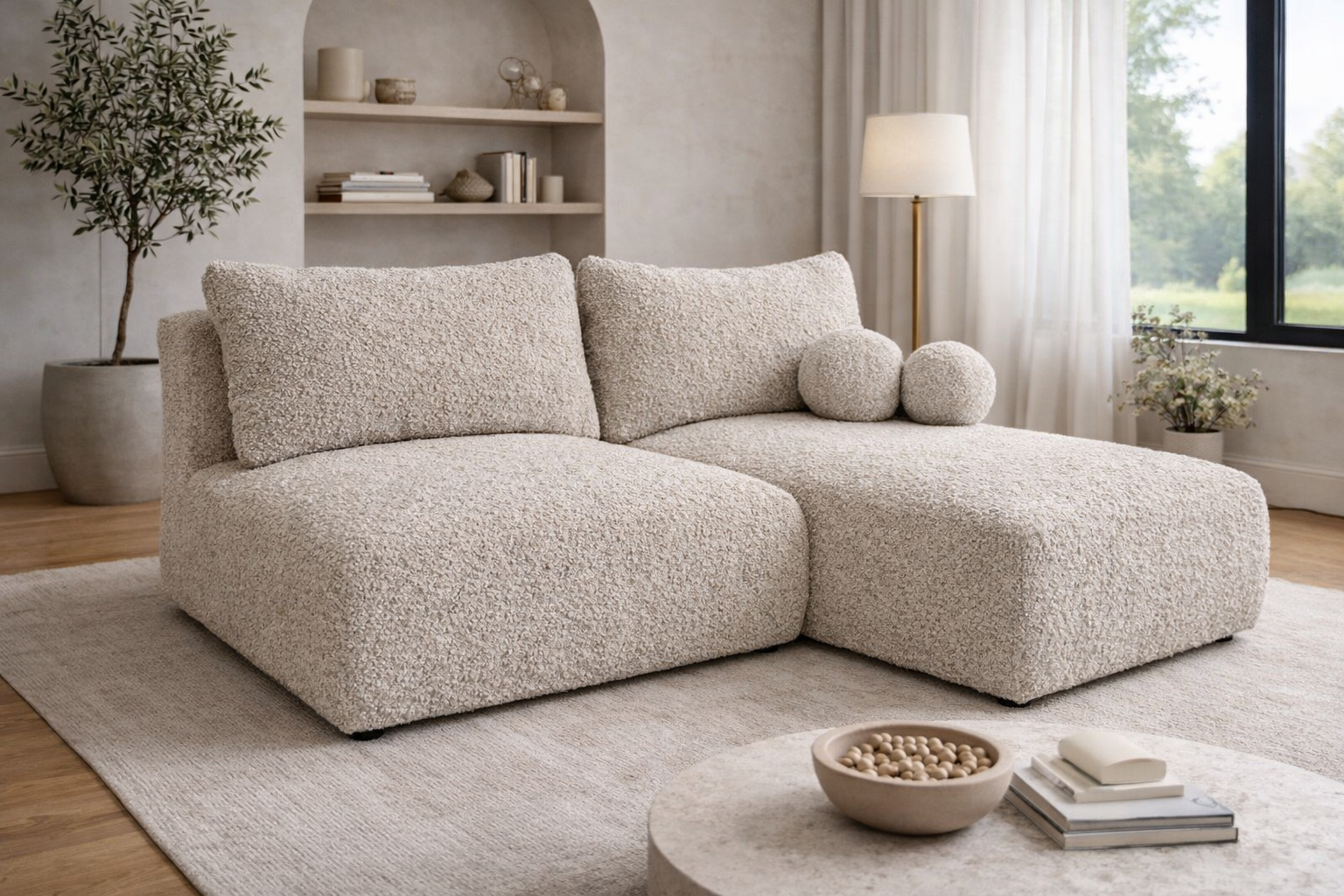 Narożnik Frappe Mini to nowoczesny narożnik modułowy zaprojektowany z myślą o funkcjonalności i komforcie użytkowania. Miękka forma, tapicerka bouclé typu baranek oraz możliwość dowolnej konfiguracji sprawiają, że idealnie sprawdzi się zarówno w mniejszych, jak i większych salonach.