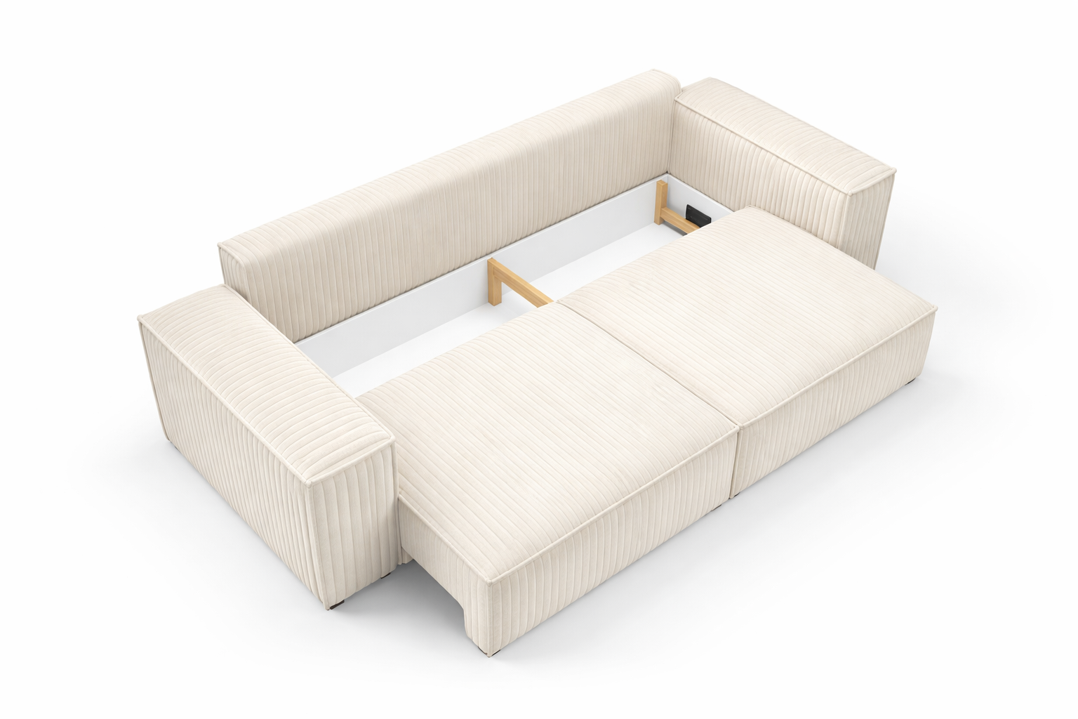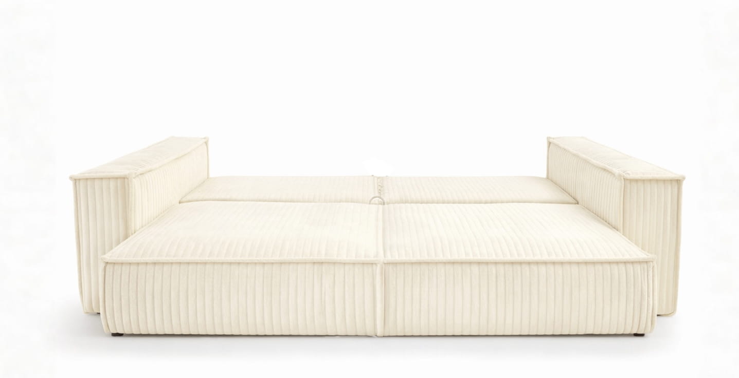 Kanapa z funkcją spania NOVU10 255×105 cm w tkaninie TILIA DAVIS. Szerokie, miękkie pasy inspirowane sztruksem, automat DL i pojemnik na pościel. Nowoczesna sofa do salonu.