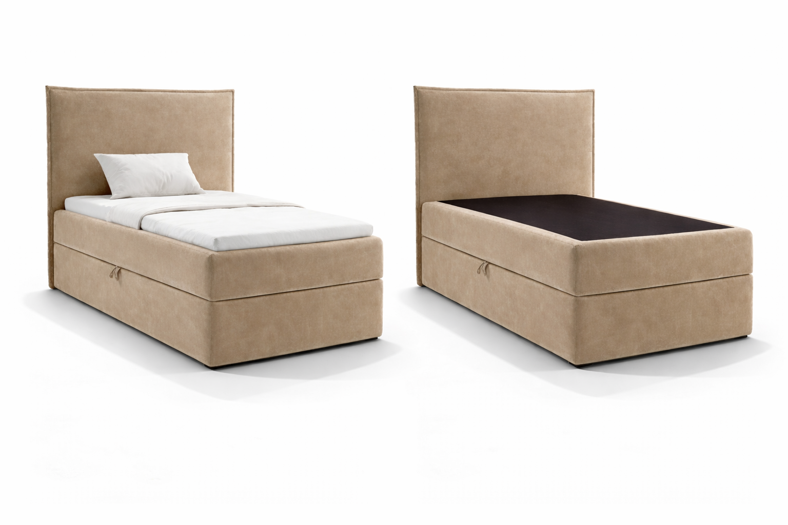 Nowoczesne łóżko kontynentalne jednoosobowe 70x200 z wbudowanym materacem bonelowym, które zapewnia wygodny i stabilny sen. Model MINI NOVU wyposażony jest w praktyczny pojemnik na pościel otwierany na automatach, co ułatwia codzienne użytkowanie. Tył łóżka obity tkaniną – idealne do ustawienia w dowolnym miejscu sypialni. Dostępna szeroka gama tkanin i kolorów oraz możliwość zamówienia w innych rozmiarach: 70x200, 80x200, 90x200, 100x200. Opcjonalnie topper piankowy 4 cm dla jeszcze większego komfortu.