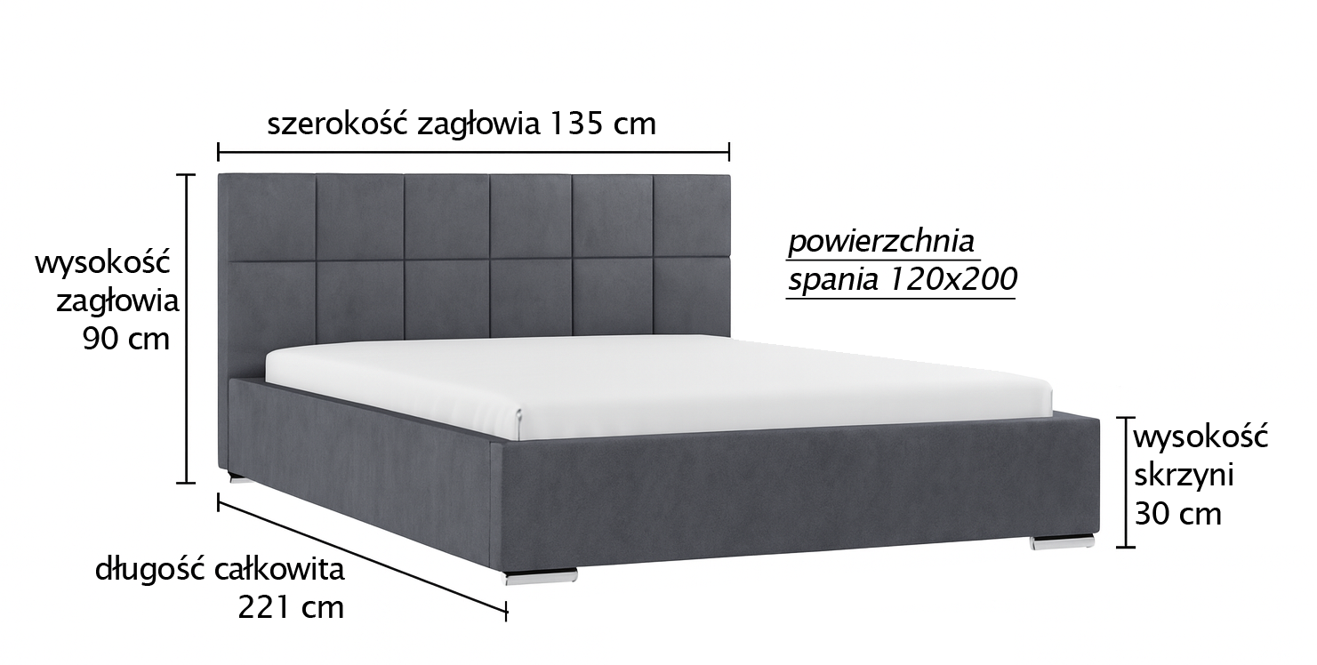 Powierzchnia spania: 120×200 cm | Wys. zagłówka: 90 cm | Wys. skrzyni: 30 cm | Szer. zagłówka: 135 cm | Dł. całkowita: 221 cm