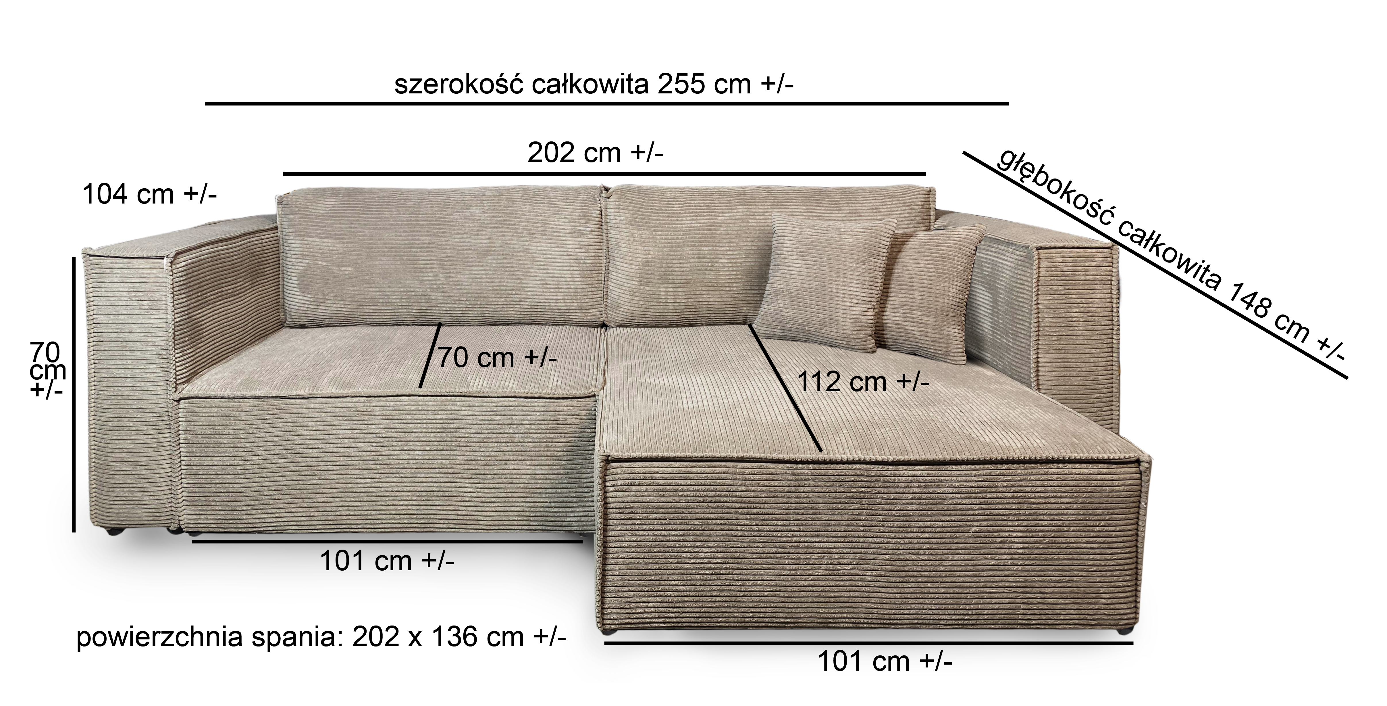 • Podane wymiary mogą różnić się o ok. +/- 3–5 cm (standard dla mebli tapicerowanych).