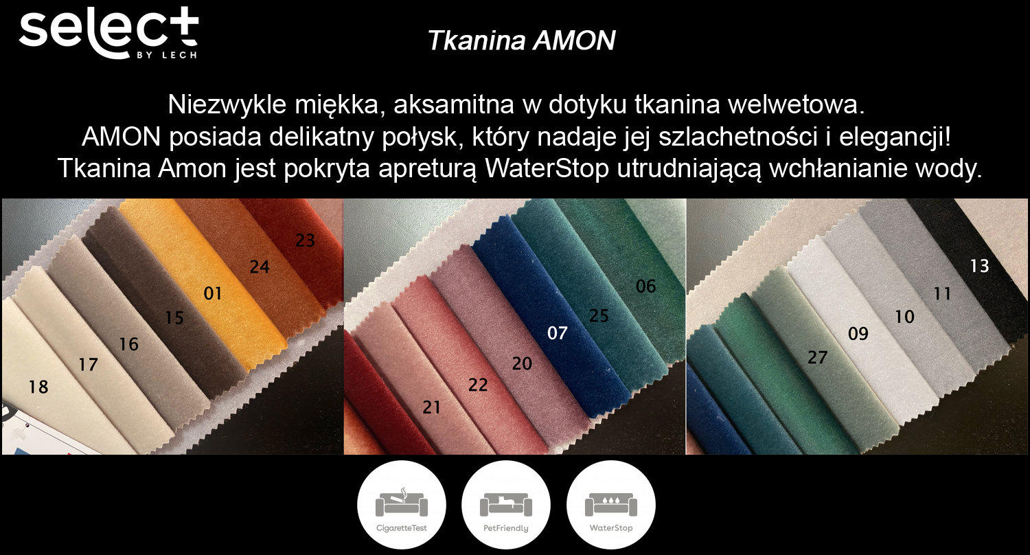 Dostępny w najmodniejszych tkaninach POSO (sztruks), BOUCLE (baranek) oraz WELUR (kronos & paros )