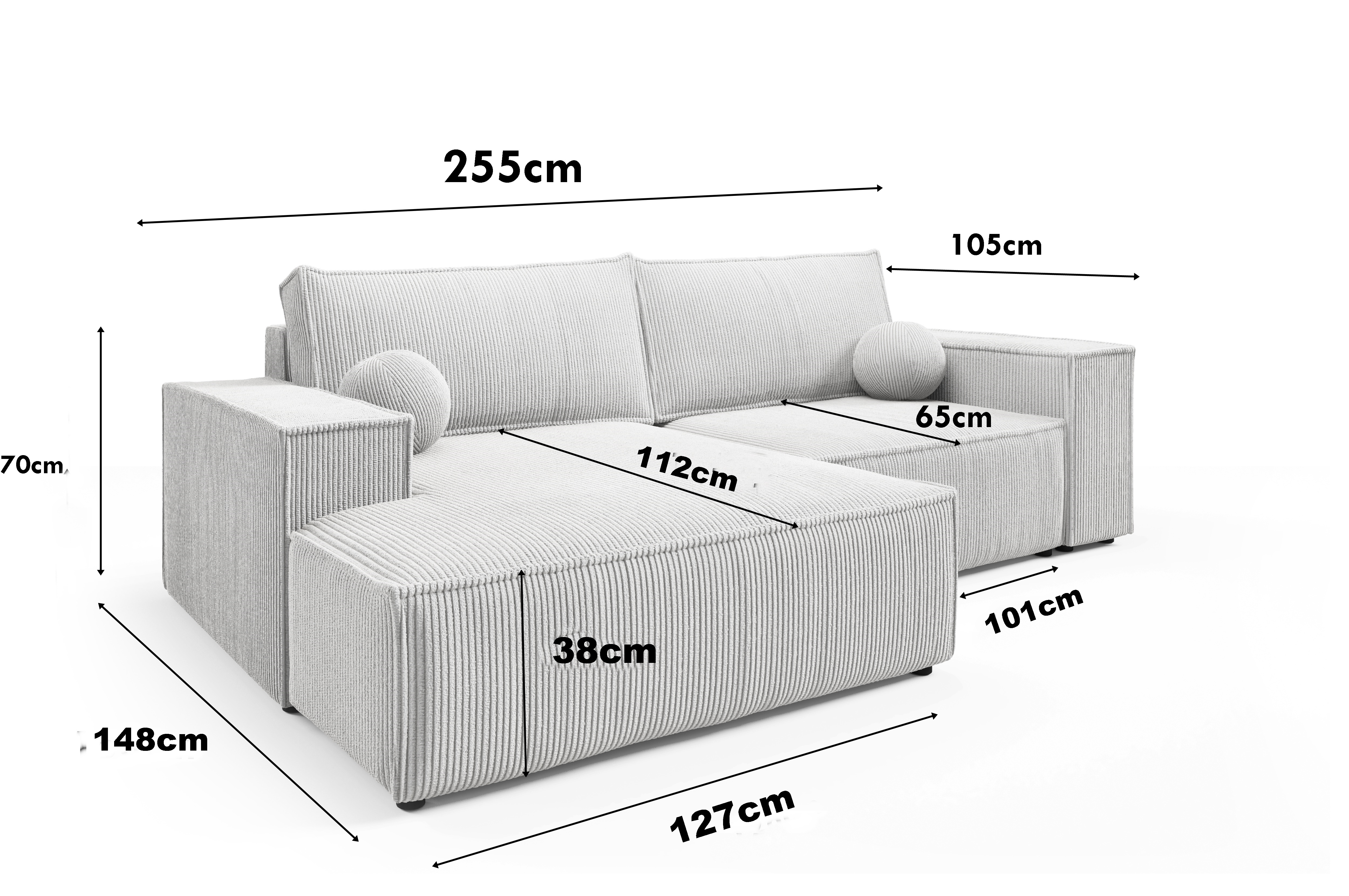 Narożnik rozkładany NOVU MINI funkcja spania sztruks boucle welur automat pojemnik na pościel L-kształt 255x148 cm LEWY/PRAWY