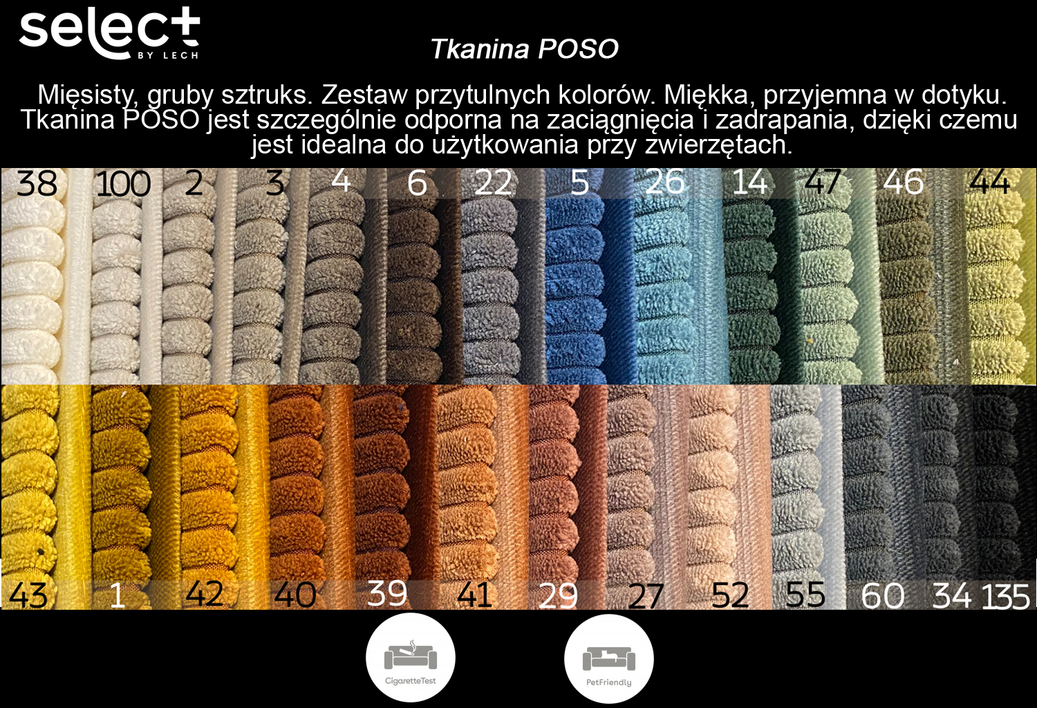 Dostępny w najmodniejszych tkaninach POSO (sztruks), BOUCLE (baranek) oraz WELUR (kronos & paros & monolith & AMON )
