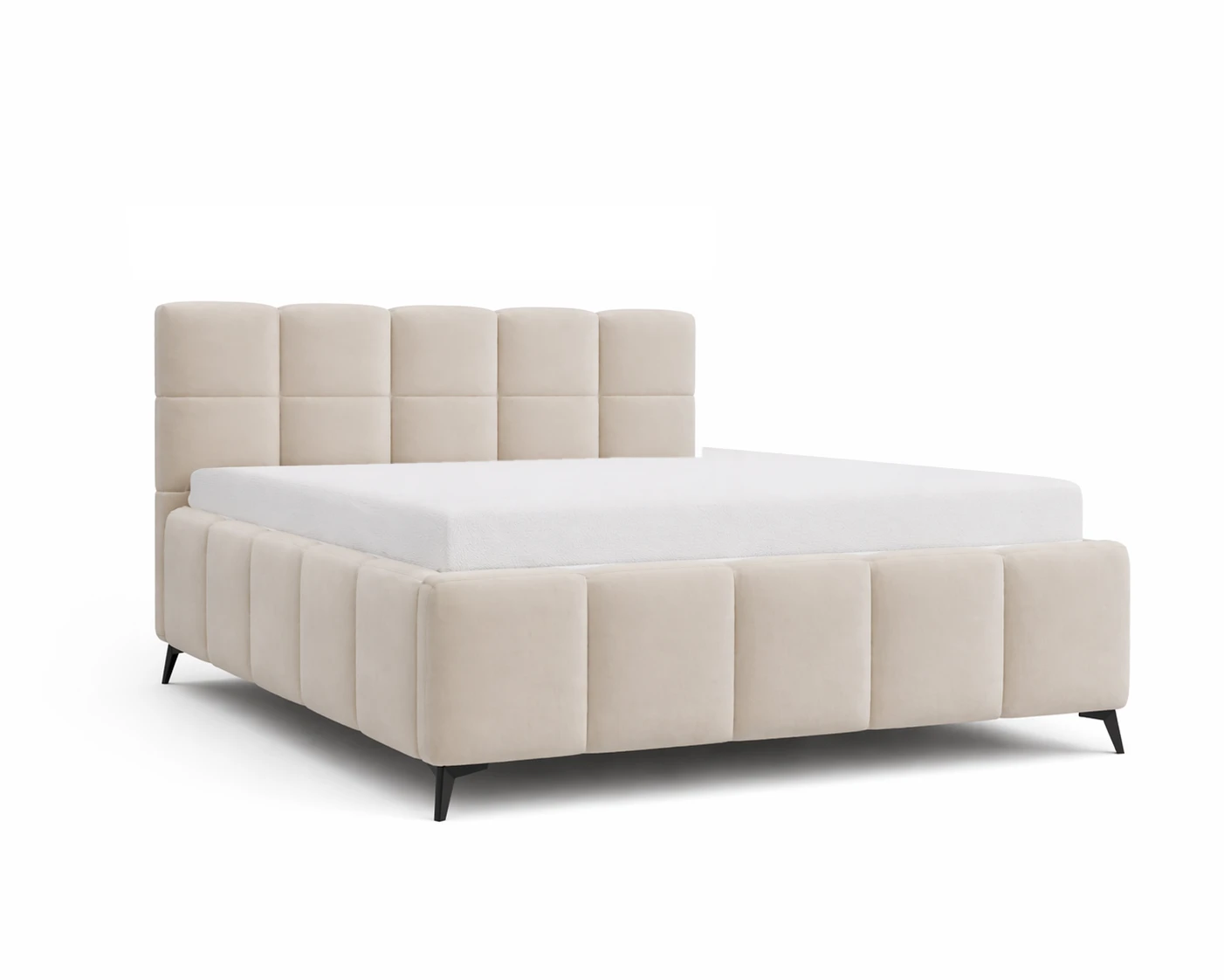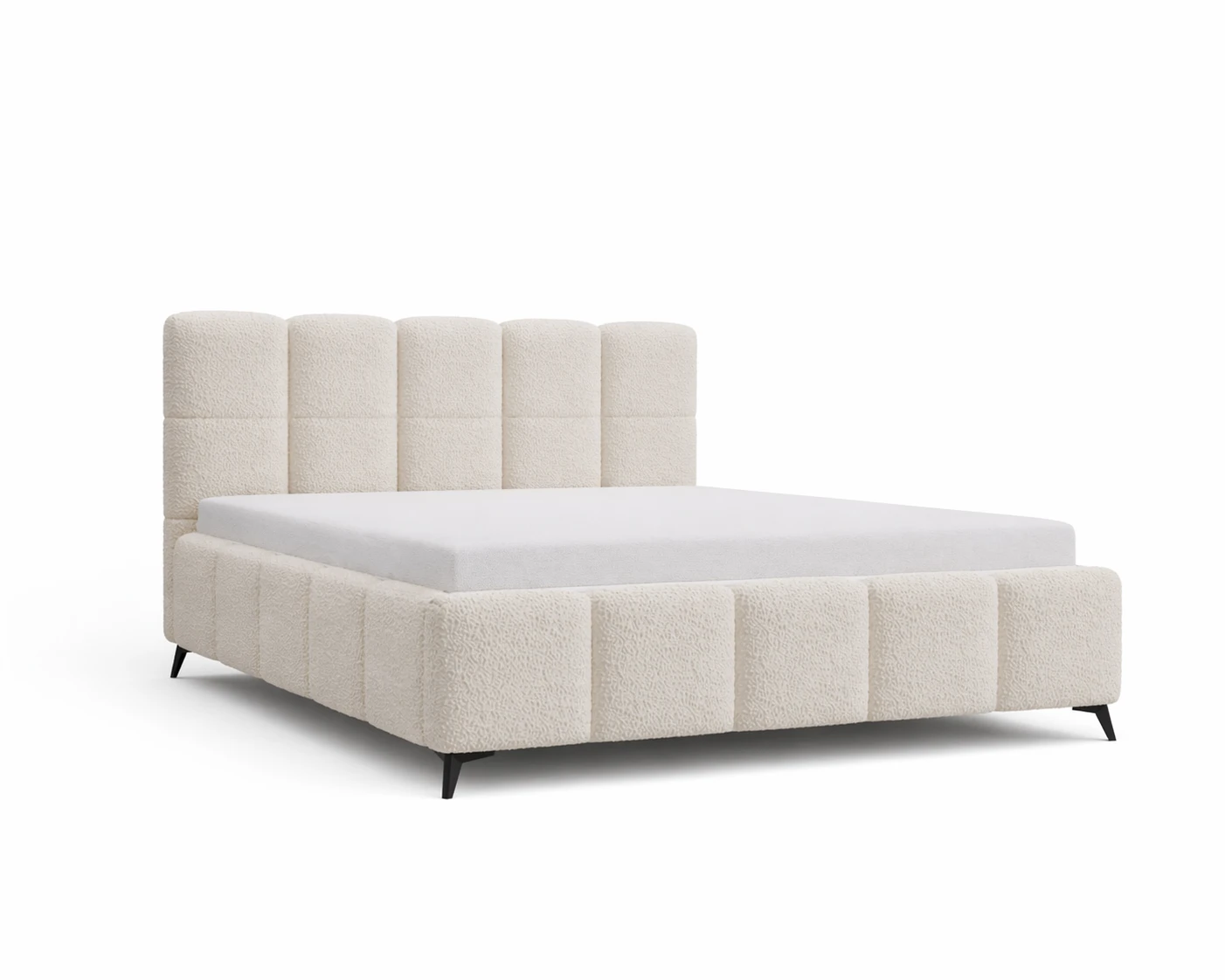 Łóżko NOLE wyróżnia się elegancką formą oraz pionowymi przeszyciami, które nadają mu nowoczesny i spójny wygląd. Miękkie wykończenie i zaokrąglone kształty wpisują się w aktualne trendy wnętrzarskie.
