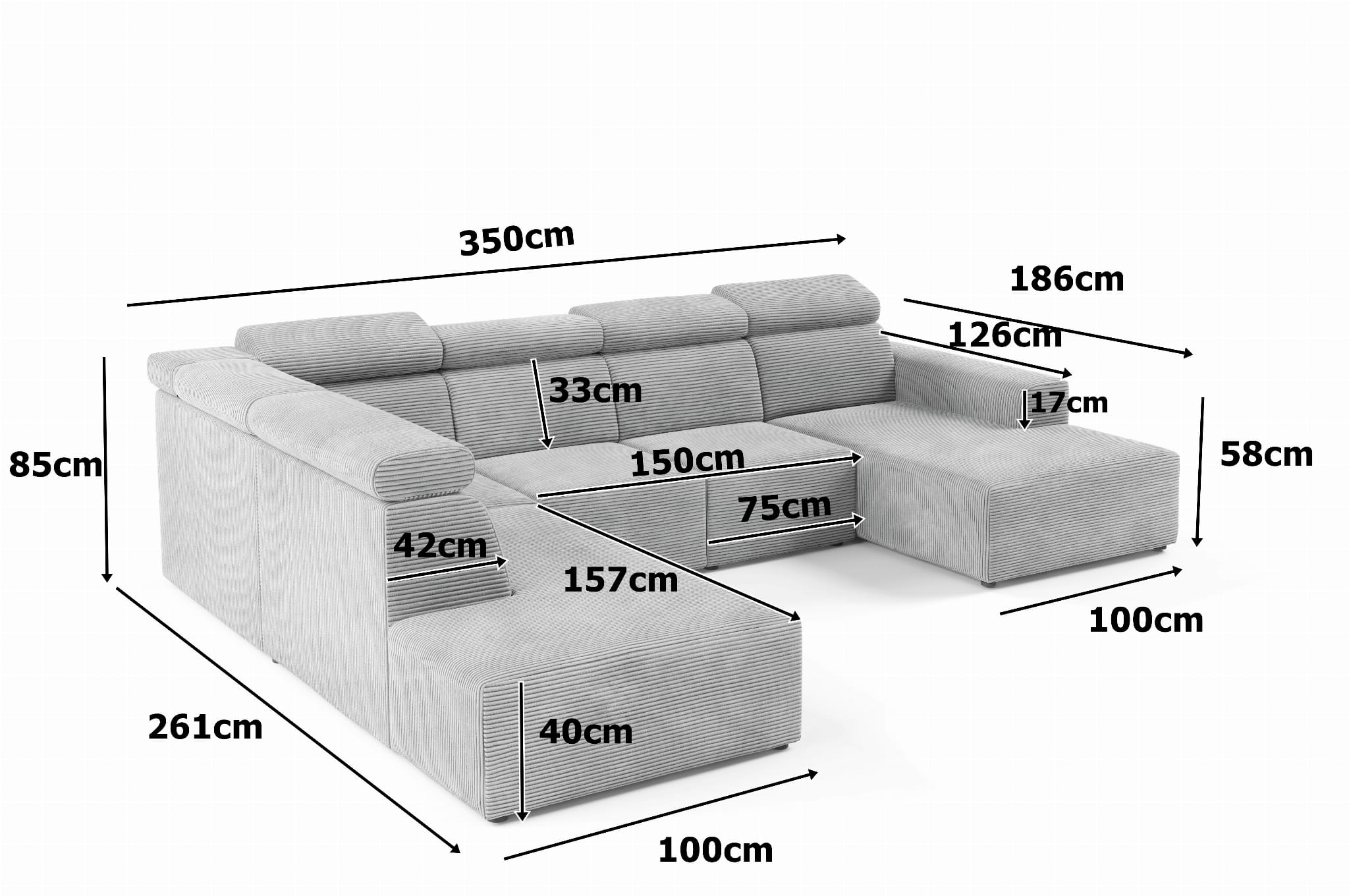 Nowoczesny duży narożnik z regulowanymi zagłówkami KLARA 5 U-KSZTAŁT 350x261cm