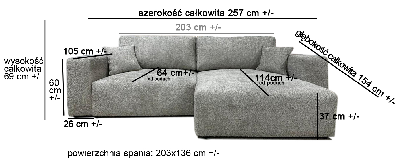 Dane techniczne:- szerokość: 257 cm +/- - poduszki posiadają poszewki na zamek, co daje możliwość ściągnięcia do prania