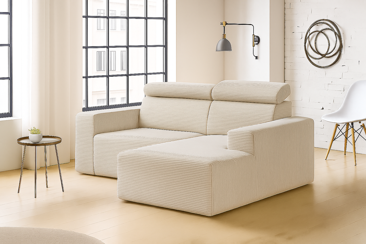 Nowoczesny narożnik z regulowanymi zagłówkami KLARA L w kolorze beżowym, tkanina sztruks , strona PRAWANowoczesny, elegancki - ponadczasowy stylDzięki regulowanym zagłówkom Twój odpoczynek wkroczy na niesamowity poziom.