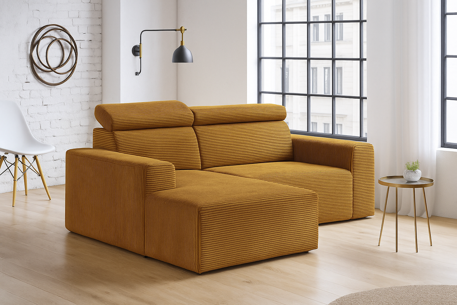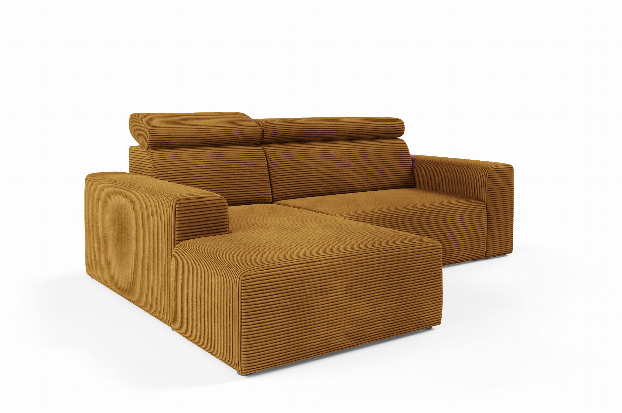 Nowoczesny narożnik z regulowanymi zagłówkami KLARA L w kolorze musztardowym , tkanina sztruks , strona LEWANowoczesny, elegancki - ponadczasowy stylDzięki regulowanym zagłówkom Twój odpoczynek wkroczy na niesamowity poziom.