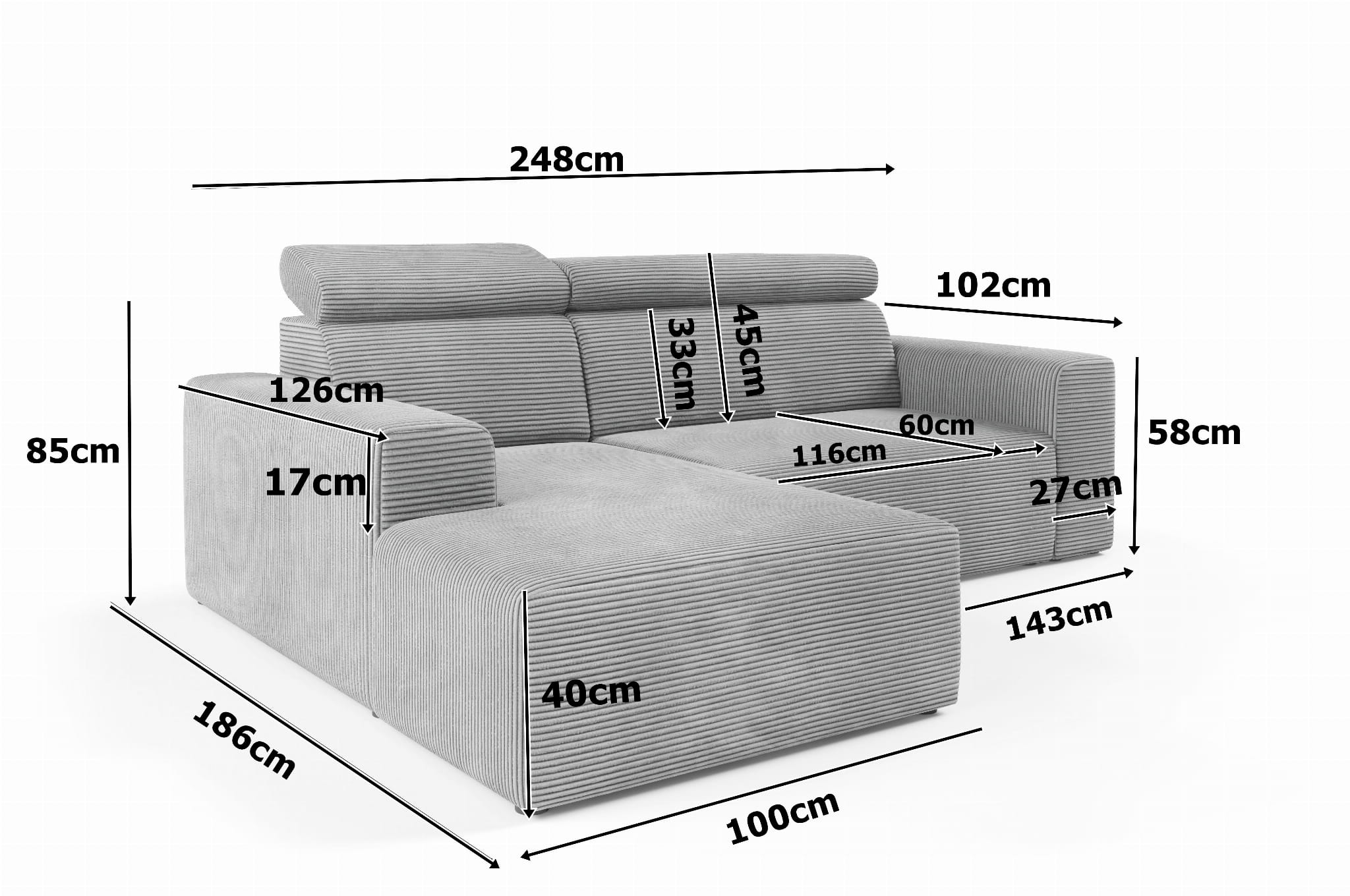 Nowoczesny narożnik z regulowanymi zagłówkami KLARA L sztruks KOLORY