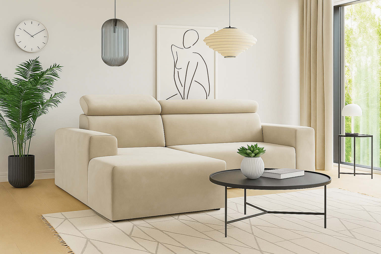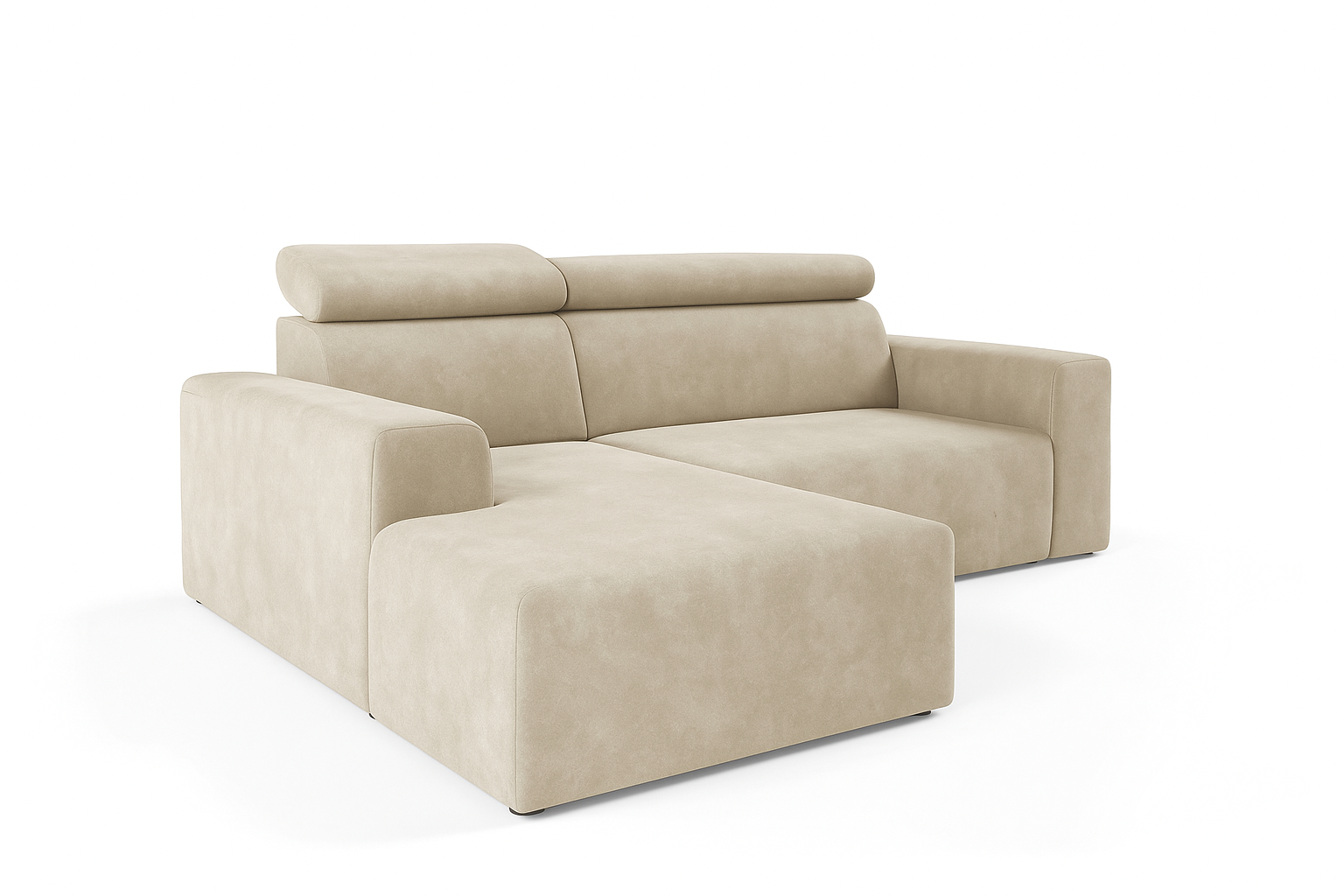 Nowoczesny narożnik z regulowanymi zagłówkami KLARA LNowoczesny, elegancki - ponadczasowy stylDzięki regulowanym zagłówkom Twój odpoczynek wkroczy na niesamowity poziom. NA ZDJĘCIU TKANINA MONOLITH02 - beżowy welur łatwoczyszczący |
