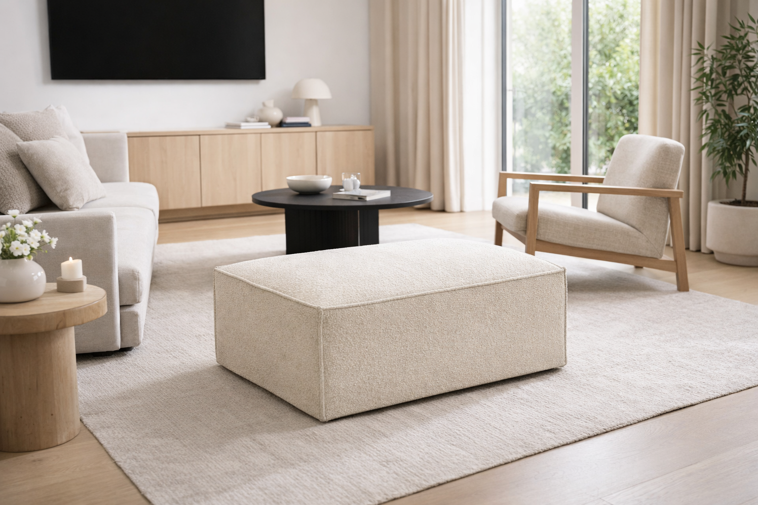 Pufa AMBER w tkaninie boucle – nowoczesny podnóżek do salonu